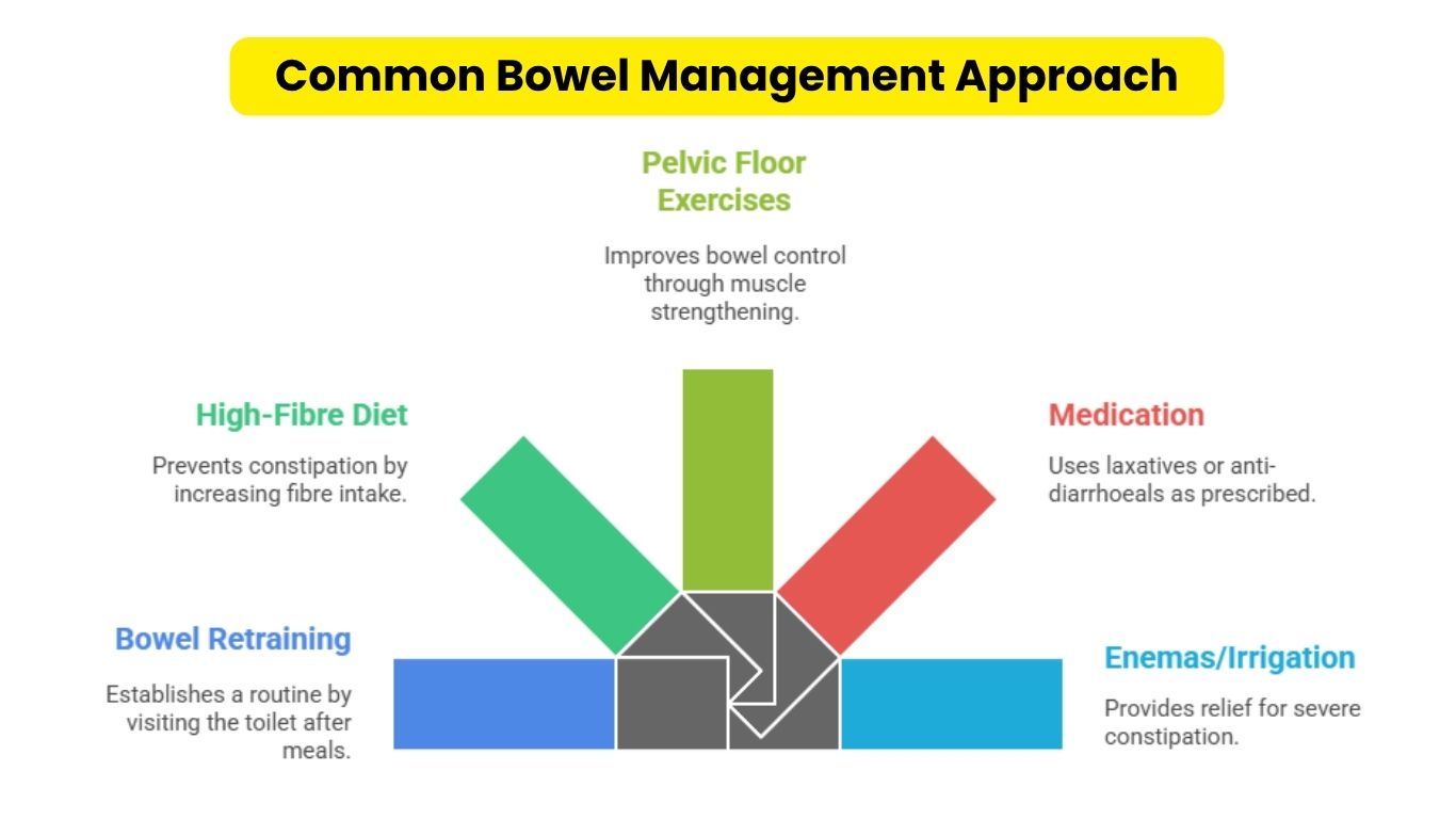 • Bowel retraining: visiting the toilet after meals to build routine.